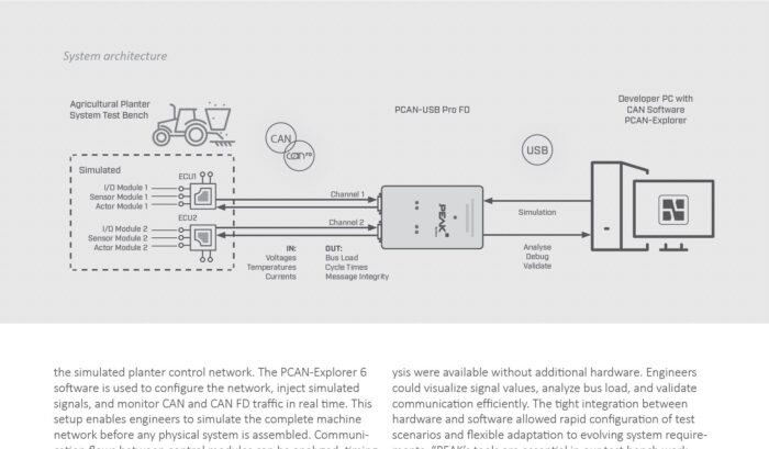 Modern agricultural planting systems rely on multiple electronic control units (ECUs), sensors, and actuators working together in precise, deterministic ways. These modules communicate over CAN and CAN FD networks and must maintain strict timing, message integrity, and predictable bus loads to ensure accurate planting operations.